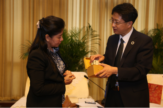 张兴会校长向Keo Sophannara司长赠送了由我校学生制作的“鲁班锁”
