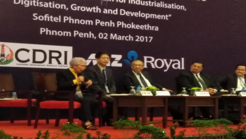 中德校园网讯(通讯员 国际交流与合作处 吴刚)应柬埔寨政府顾问、柬埔寨发展研究院(CDRI)理事会主席索西帕那博士的邀请,我校张兴会校长一行2人于3月2日参加了由柬埔寨国家发展研究院主办的“2017柬埔寨工业化信息化展望年会”。会上,张校长作了题为“发展职业教育 培养应用型人才”的主旨演讲,并与来自亚洲开发银行、新加坡科技教育研究所和柬埔寨信息通信技术联盟的3位专家进行了圆桌讨论。